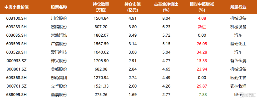 另外两只基金,中庚价值领航和中庚价值品质也都买到了重仓股第三位,占比都在5%以上。