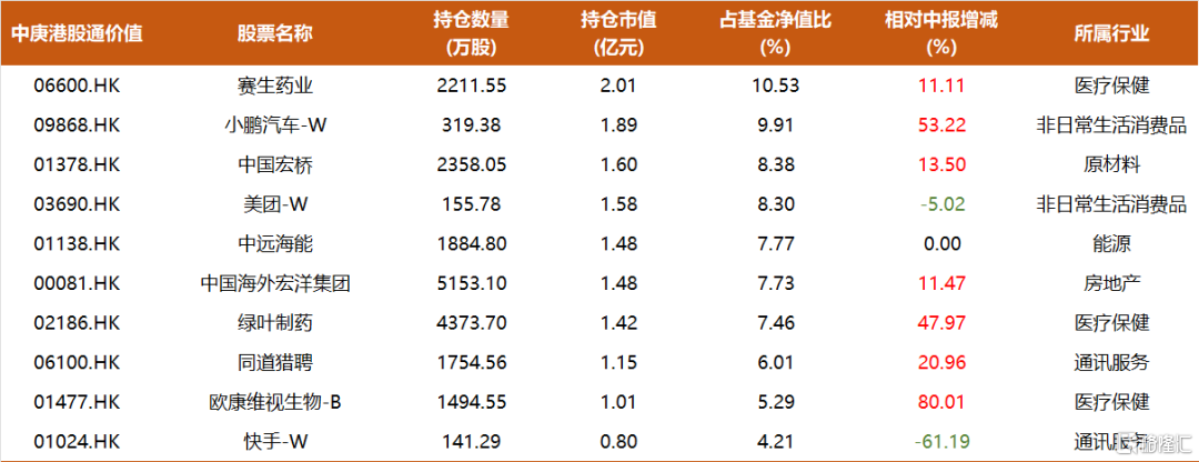 其中,中庚港股通价值直接将其买到了仅次于赛生药业的第二大重仓,占比高达9.91%。