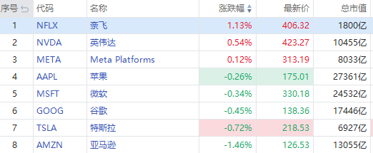 大型科技股涨跌不一,截至发稿,奈飞涨超1%,英伟达、Meta跟涨;亚马逊跌超1%,谷歌、微软、苹果跟跌。