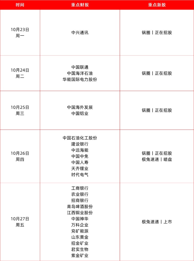 港股新股方面,锅圈正在火热认购中,预计11月2日上市;东南亚第一大快递运营商,极兔速递将于10月27日上市。