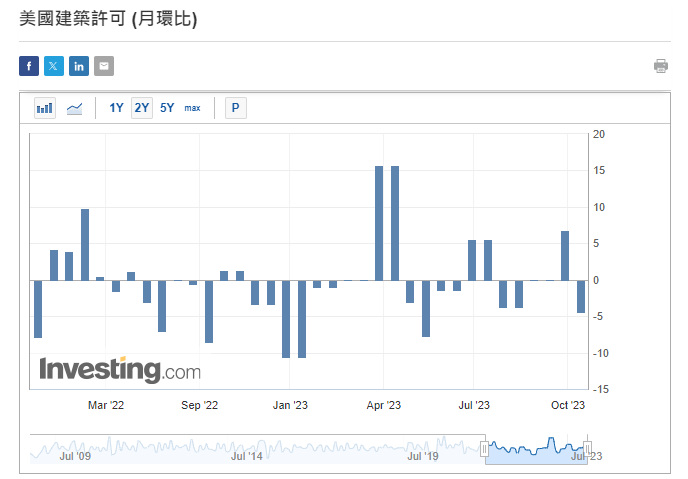 9月份建筑许可按月下跌4.4%至年率计147.3万间,跌幅少过预期跌5.9%至年率计145.3万间。同月份新屋开工同按月升7%至年率计135.8万间,但升幅少过预期升8.5%至年率计138.3万间。同月份成屋销售按月跌2%至年率计396万间,跌幅少过预期跌3.7%至年率计389万间。更创出自2010年以来最低。10月份费城联储制造业指数负9,高过预期负6.4,唯比上月负13.5略见收窄。