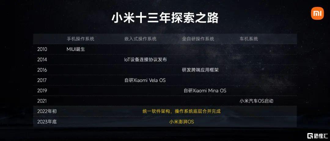 2022年初,我们决定统一MIUI、Vela、Mina、车机OS四个系统的软件架构。自此,小米的操作系统底层合并完成。
