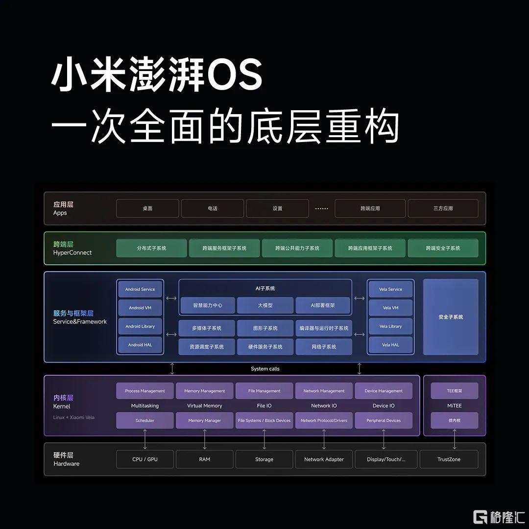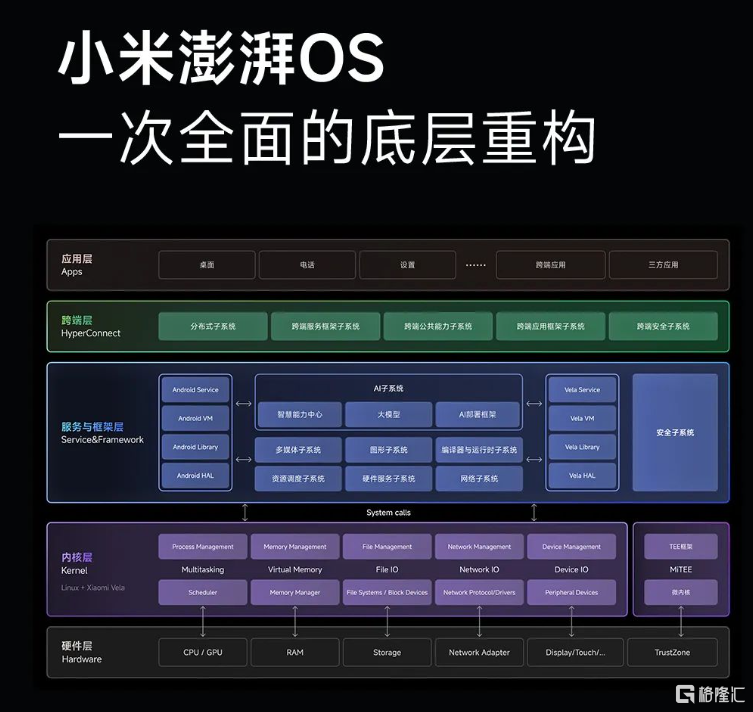 跟大家分享一张小米澎湃OS 的完整系统架构。这个架构图背后,凝聚着小米创业13年来,数千名工程师研发探索的心血。从2010年MIUI诞生起,小米在OS方面的研发探索,覆盖了手机操作系统、嵌入式操作系统、纯自研通用操作系统、车机系统等全部领域,最终在小米澎湃OS上并线合流,如今拥有一支5000多名工程师的操作系统研发团队。可以说,小米的创业史,就是一段操作系统研发的探索史。