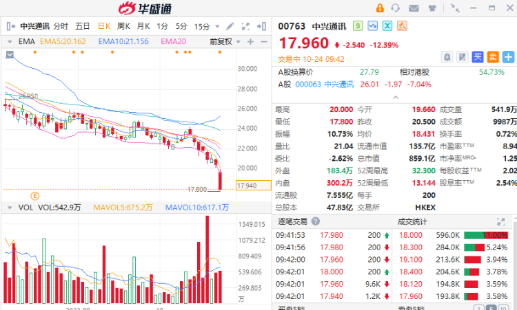 10月24日讯,港股中兴通讯(00763)早盘低开超4%,截至发稿,暴跌12.39%,报17.96港元,成交额9987万港元。