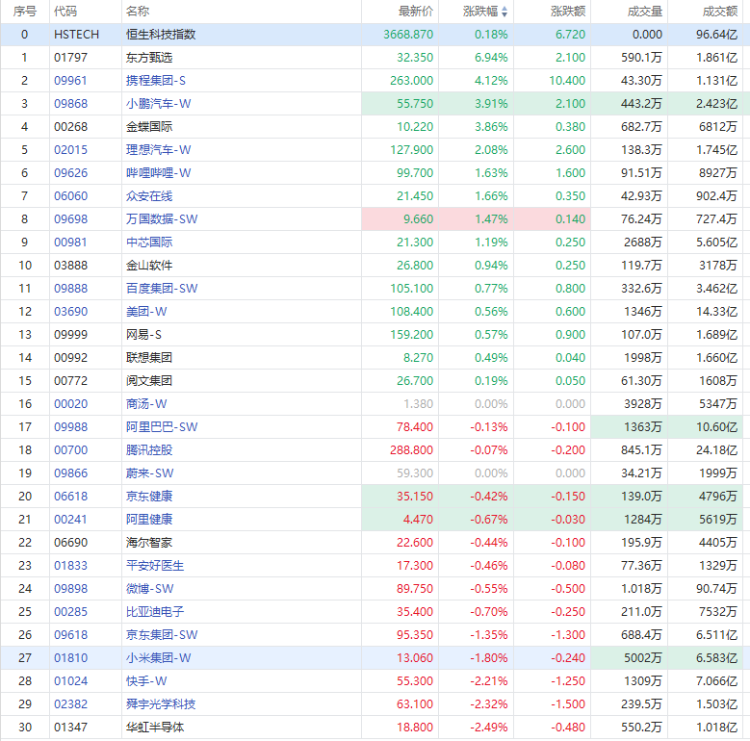 东方甄选升近7%领涨成分股,截至发稿,科网股走势分化,携程集团-S涨超4%,哔哩哔哩-W涨1.63%,腾讯控股、阿里巴巴-SW微跌。