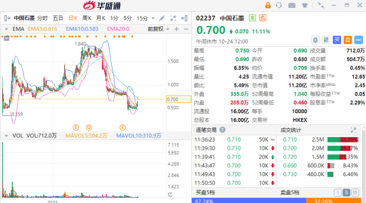 中国石墨(02237)早盘上涨11.11%,现报0.70港元,成交额504.74万港元。