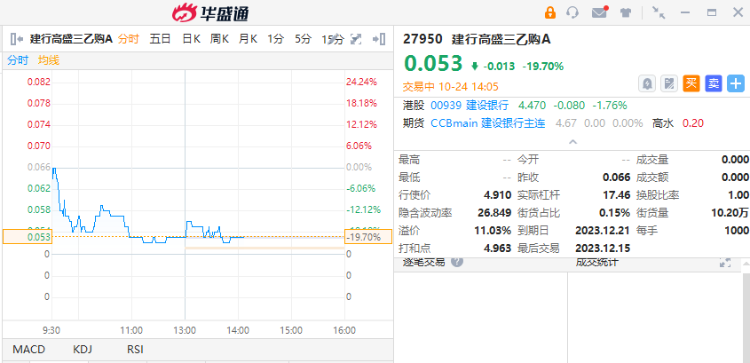 建行购27950 $27950.HK ,行使价4.91港元,2023年12月21日到期,实际杠杆17.8倍,高杠杆、低面值