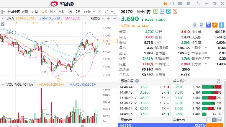 10月24日讯,中国中药(00570)午后涨近8%,截至发稿,涨7.58%,报3.69港元,成交额1.43亿港元。