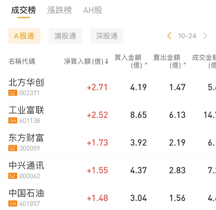 华盛资讯10月24日讯,南向资金今日净买入港股23.25亿港元,其中港股通(沪)净买入35.53亿港元,港股通(深)净卖出12.28亿港元。