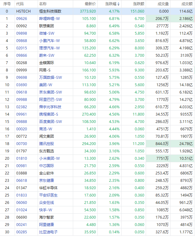 科网股全线反攻,哔哩哔哩-W、微博-SW涨超6%,网易-S、美团-W、京东集团-SW涨超5%,腾讯控股涨近4%。
