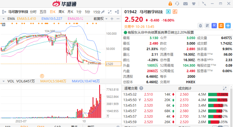 10月26日讯,马克数字科技今日再跌16%,当前成交额1.742亿港元。10月25日南向资金增持802.6万股马可数字科技(01942.HK)。近5个交易日中,获南向资金增持的有5天,累计净增持3965.8万股。近20个交易日中,获南向资金增持的有17天,累计净增持9642.8万股。截至目前,南向资金持有马可数字科技(01942.HK)9647.0万股,占公司已发行普通股的14.9%。