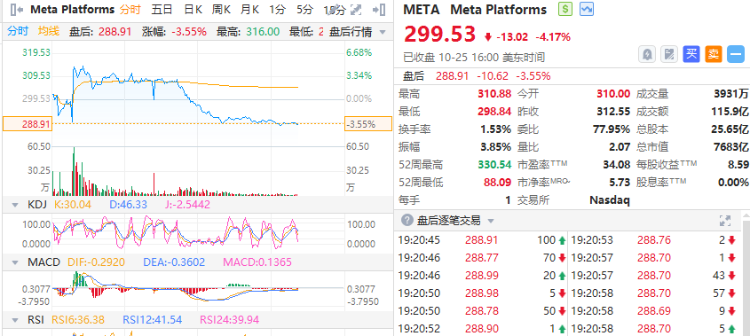 Meta股价收报299.53美元,盘后交易一度上涨5.5%,随后转跌,截至发稿跌超3%。