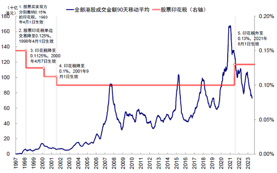 香港特区行政长官李家超在2023年《施政报告》中提出,股票交易印花税税率将由当前的0.13%下调至0.1%,从而降低投资者的交易成本、提振市场情绪,以提升香港股票市场竞争力。从财政收入角度,根据香港特区政府此前估算,若将印花税调降至0.1%将使政府减少约123亿元的财政收入,相当于2022年财政收入的2%,影响相对有限。2022财年股票交易印花税收入为531亿港元,印花税总计收入约700亿港元,占6,221亿港元总财政收入的11%。对于市场而言,短期上看,印花税下调或更多从情绪上提振市场。根据历史经验,下调印花税后,指数层面有望迎来阶段性提振,但规律并不一致,也说明持续的反弹也还需要更多基本面因素配合;中长期来看,调降印花税有利于降低交易摩擦成本,增强市场流动性,提升市场交易额中枢。