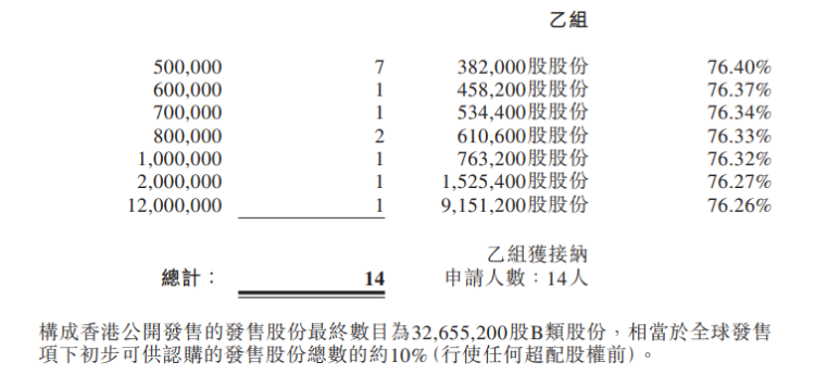 国际发售已获小幅超额认购,国际发售项下共有5.6亿股发售股份(包括基石投资者认购的股份)已获认购,相当于国际发售中初步可供认购的发售股份总数的约1.91倍。国际发售的发售股份最终数目为2.939亿股B类股份,占全球发售中(超额配股权行使之前)初步可供认购发售股份总数的约90%。国际发售超额分配4898.24万股发售股份。