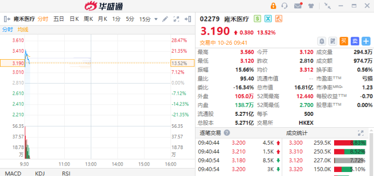 雍禾医疗(02279)早盘走强,截至发稿,涨13.52%,报3.19港元,成交额974.7万港元。