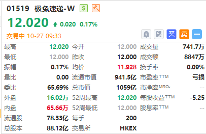 华盛资讯10月27日讯,快递运营商极兔速递-W首挂平开,截至发稿微涨0.17%,当前成交额8847万港元,最新总市值1059亿港元,该股昨日暗盘收跌1.17%。