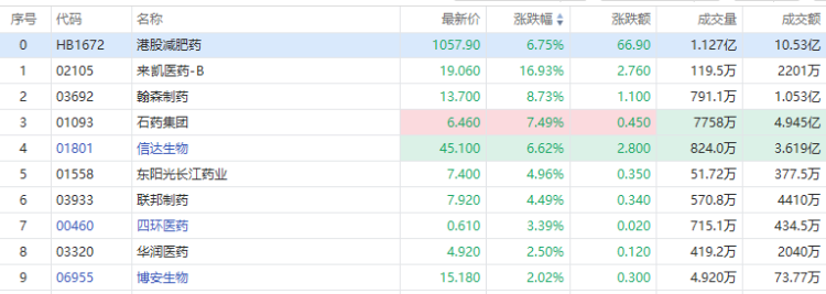 华盛资讯10月27日消息,港股减肥药概念受捧,截至发稿,来凯医药-B狂飙16%,翰森制药再升8%,石药集团涨超7%,信达生物涨超6%。创新药板块整体走强,截至发稿,云顶新耀-B涨超11%,君实生物、中国生物制药涨超9%。