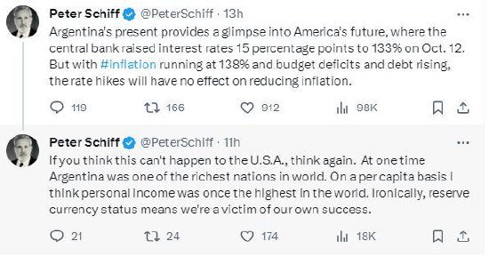 在另一条推文串中,希夫写道:“从阿根廷的现状可以窥见美国的未来。10月12日,阿根廷央行将利率提高了15个百分点,至133%。但在通胀率高达138%、预算赤字和债务不断上升的情况下,加息对降低通胀没有任何效果。”