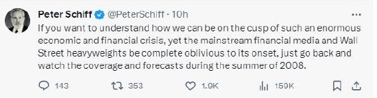 华尔街资深投资者、知名经济学家彼得·希夫周四在一连串推文中对美国经济前景发出了警告,认为现在的情况与2008年之前相似,美国正面临一场巨大的经济和金融危机的冲击。