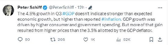 希夫首先对周四公布的美国第三季度GDP数据进行了评论,称“第三季度GDP增长4.9%并不意味着强于预期的经济增长,而是比官方报告更高的通胀率。GDP的增长是由更高的消费和政府支出推动的。但更多的增长来自于更高的价格,而不是GDP平减指数所分配的3.5%。”