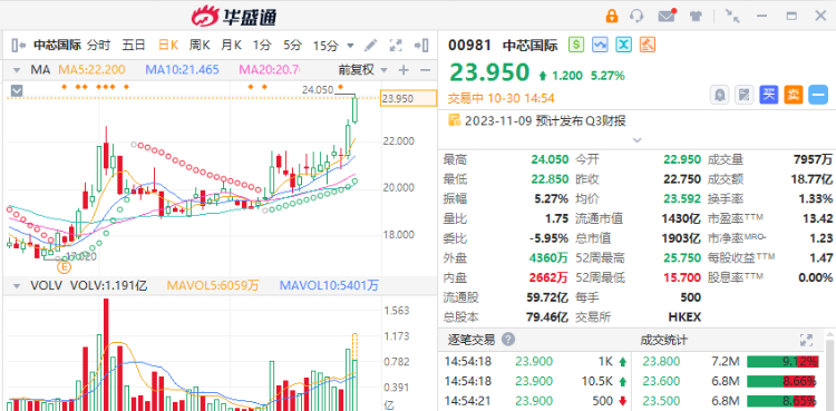 今日港股半导体板块表现活跃涨幅居前。截至发稿,中芯国际(00981.HK)涨超5%,上海复旦(01385.HK)涨超5%、华虹半导体(01347.HK)涨超4%。