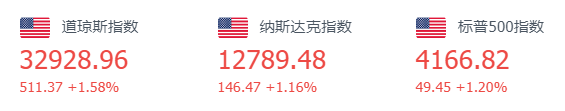 截至周一收盘,美股集体收涨,道指涨1.58%,标普500指数上涨1.16%,纳斯达克综合指数上涨1.16%;明星科技股普涨,亚马逊涨近4%,奈飞涨3%,Meta涨2%,谷歌A涨近2%,特斯拉跌近5%;芯片股涨跌不一,西部数据涨超7%,英伟达收涨近2%,ARM跌超2%。