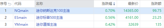 华盛资讯10月30日消息,美股三大期指集体走高,截至发稿,纳指期货 $NQmain 现涨0.70%,标普500指数期货 $ESmain 涨0.56%,道指期货 $YMmain 涨0.42%。