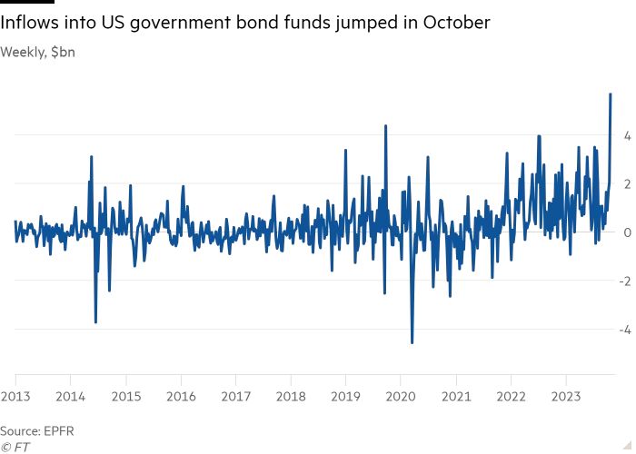 投资者对债券市场反弹的信心正在增强。EPFR数据显示,在截至10月25日的7天内,美国长期主权债务基金的单周资金流入达到57亿美元,创历史最高水平。