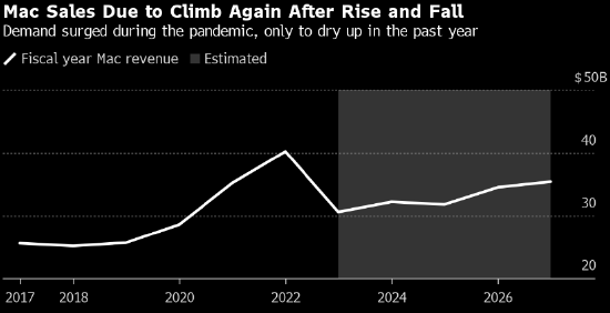 该公司的半导体业务Apple Silicon已成为其皇冠上的明珠之一。自2020年从英特尔元件改用自研芯片以来,受疫情期间科技消费广泛增长推动,苹果Mac电脑的销售大幅增长。