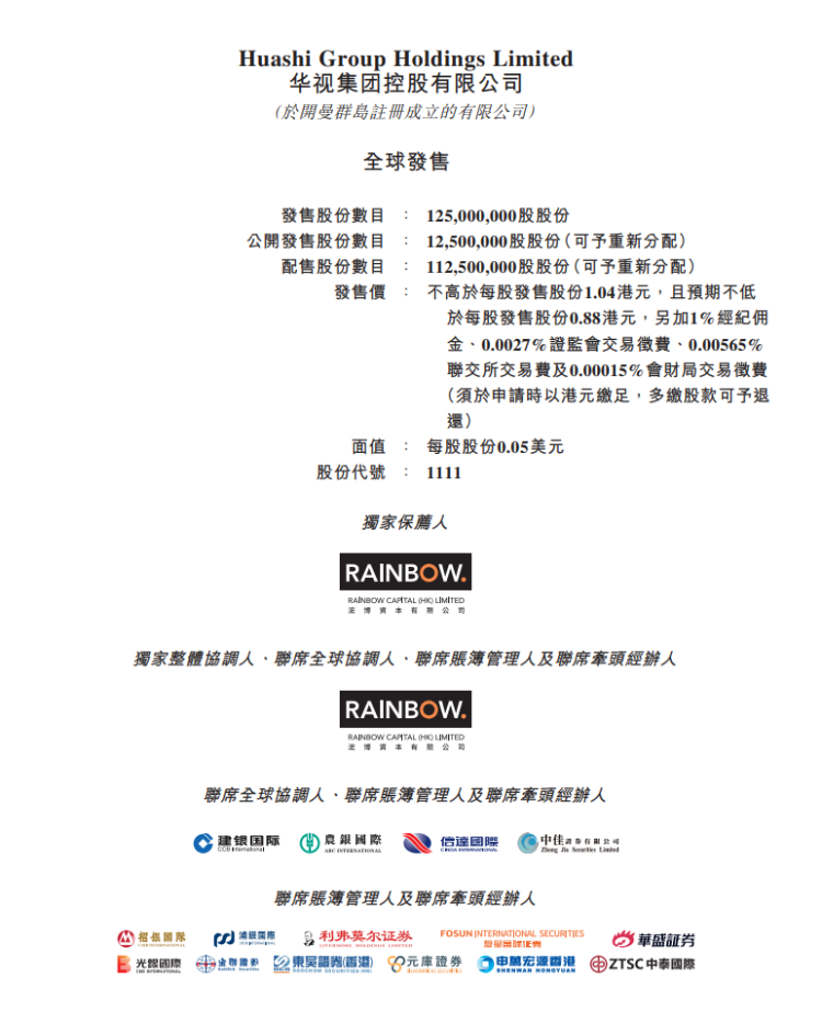 华视集团控股( $01111.HK )于2023年10月31日至2023年11月3日招股,公司拟全球发售1.25亿股股份。每股发售价0.88-1.04港元,每手4000股,预期股份将于2023年11月10日上市
