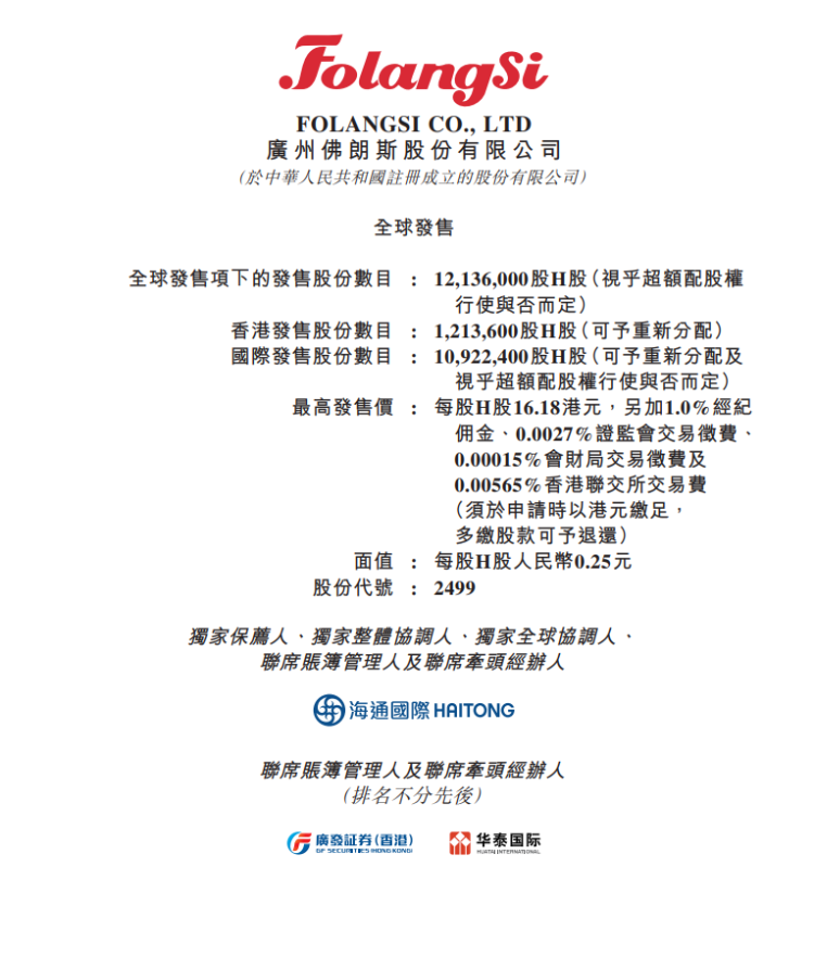 佛朗斯股份( $02499.HK )于2023年10月31日至2023年11月3日招股,公司拟全球发售1213.6万股H股。每股发售价14.18港元-16.18港元,每手200股,预期公司H股将于2023年11月10日上市