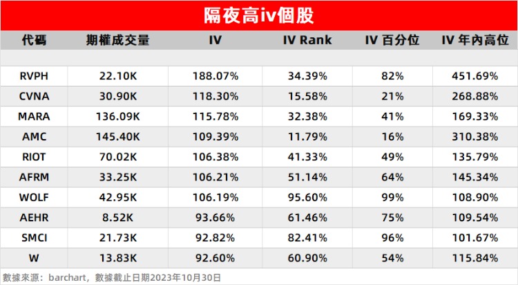 2、半导体制造商Wolfspeed $WOLF 周一当日虽跌3%,但在盘后涨超12%。隐含波动率继续保持高位。