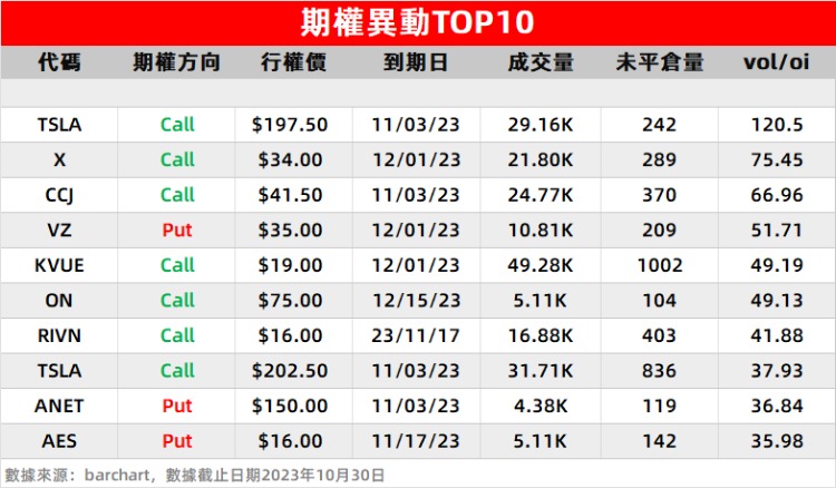 3、安森美半导体 $ON Q3业绩超市场预期,但Q4指引低于预期。受此影响,隔夜大跌21%,盘中有看涨期权异动,行权价在75美元、到期日在12月15日的看涨期权获资金抢筹,成交5110张。