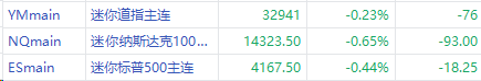 周二美股盘前,三大股指期货下跌,截至发稿,纳指期货 $NQmain 现跌0.65%,标普500指数期货 $ESmain 跌0.44%,道指期货 $YMmain 跌0.23%。