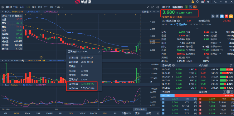 电视广播(00511)午后再涨超4%,近三日累涨约30%。截至发稿,涨4.25%,报3.68港元,成交额1705万港元。
