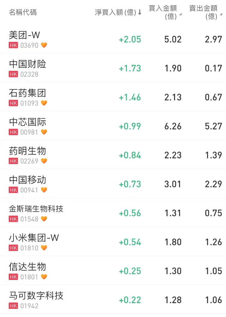 美团-W、中国财险分别获净买入2.05亿港元、1.73亿港元;腾讯控股净卖出额居首,金额为2.68亿港元,中国海洋石油遭沽出1.66亿港元。