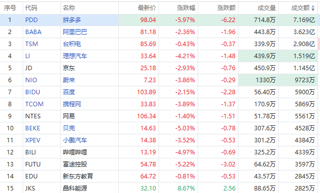 晶科能源逆势再升8%,公司昨日披露前三季度净利润同比增长279.14%。截至发稿,拼多多重挫6%,贝壳跌超5%,阿里巴巴、京东、百度均跌超2%。造车新势力蔚来、理想、小鹏汽车均跌超3%。