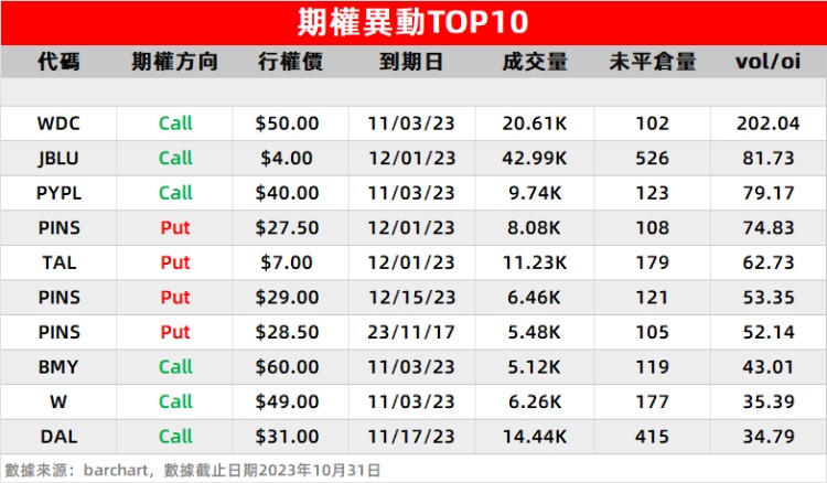1、西部数据 $WDC 季度营收27.5亿美元。市场资金抢筹行权价在50美元,到期日在11月3日,成交量2.06万张。