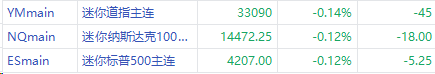 周三美股盘前,三大股指期货下跌,截至发稿,纳指期货 $NQmain 现跌0.12%,标普500指数期货 $ESmain 跌0.12%,道指期货 $YMmain 跌0.14%。