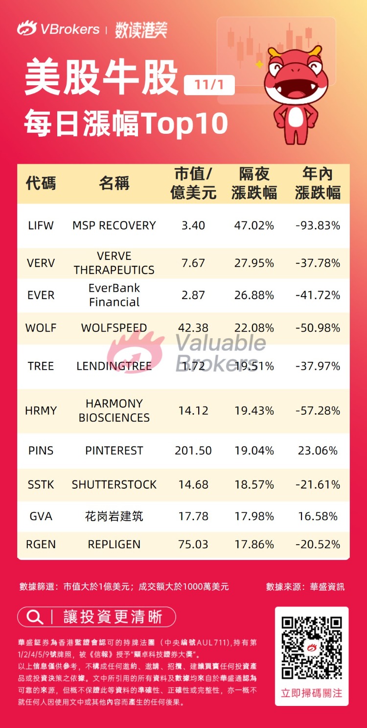 尽管美股10月表现不尽如人意,不过隔夜依然有一些绩后走牛的个股值得投资者关注。發仔梳理了每日美股涨幅Top10榜单,以下为涨幅靠前的个股:
