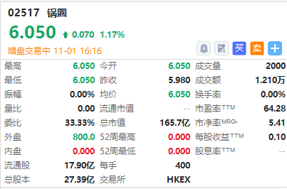 华盛资讯11月1日讯,在家火锅及烧烤品牌锅圈正在暗盘交易,截至发稿,现涨1.17%,最新总市值165亿港元,该股将于明日正式挂牌港交所上市。
