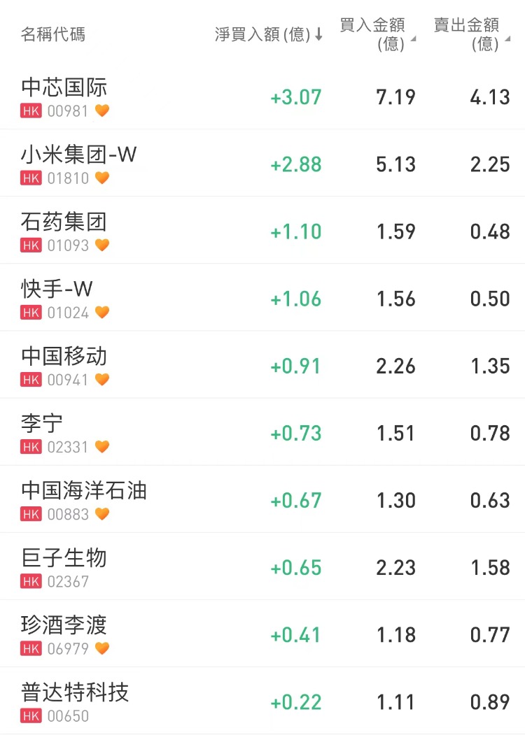 中芯国际、小米集团-W分别获净买入3.07亿港元、2.88亿港元;腾讯控股净卖出额居首,金额为3.43亿港元,海底捞遭沽出1亿港元。