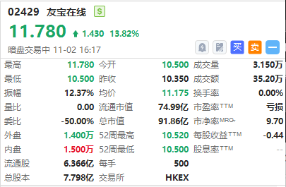 华盛资讯11月2日讯,自动售货机经营商友宝在线正在暗盘交易,截至发稿,现涨13.82%,中签一手账面浮盈逾700港元,最新总市值91亿港元,该股将于明日正式挂牌港交所上市。