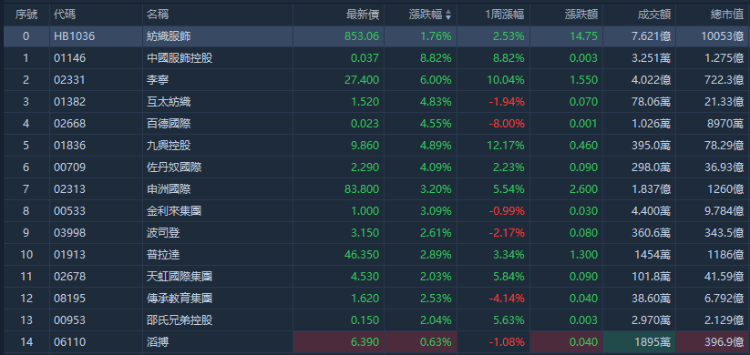 华盛资讯11月3日讯,港股纺织服装概念股拉升,李宁大涨6%,佐丹奴国际涨超4%,金利来集团涨超3%,波司登、普拉达涨超2%,滔搏跟涨。