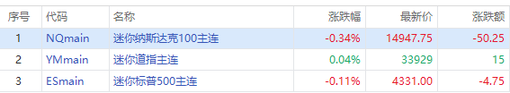 华盛资讯11月3日消息,美股昨日收高,三大股指涨幅均超1.7%。今日美股三大期指涨跌不一,截至发稿,纳指期货 $NQmain 回调0.34%,标普500指数期货 $ESmain 跌0.11%,道指期货 $YMmain 涨0.04%。