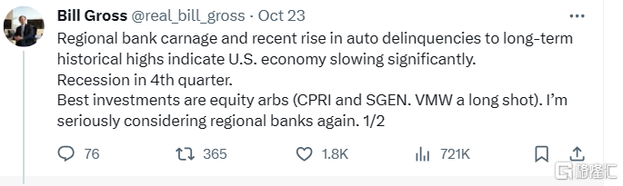 格罗斯表示,地区性银行陷入困境,以及最近汽车贷款违约率升至长期历史高位,都表明美国经济显著放缓,衰退将在第四季度到来。