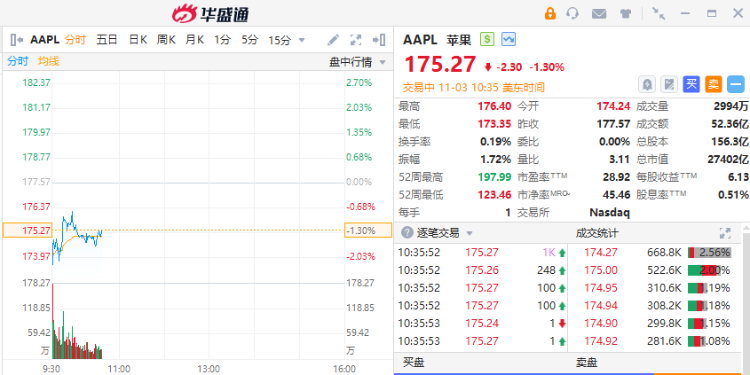 周五美股盘初,美国科技巨头苹果(AAPL.US)股价在盘初交易中下跌,截至发稿跌超2%至174美元附近。