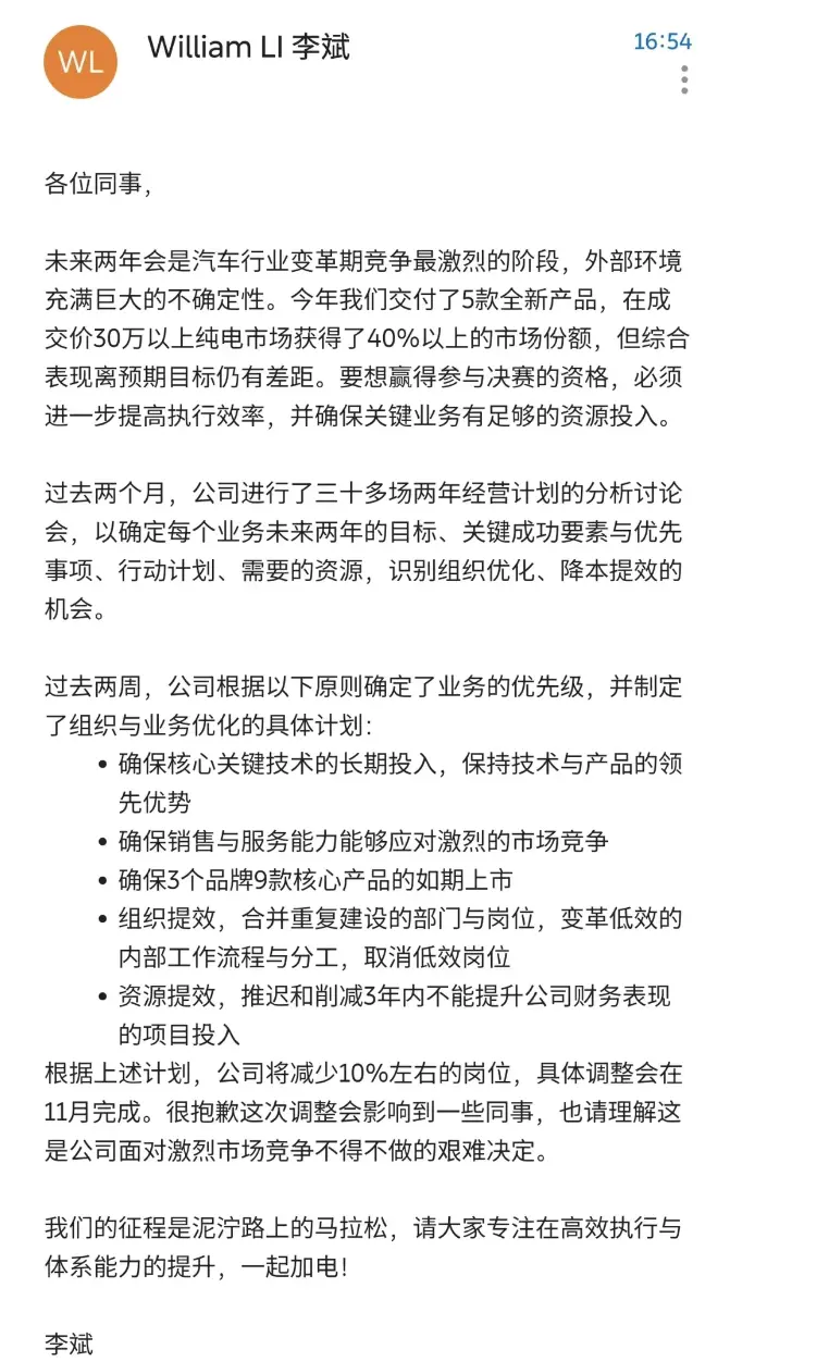 11 月 3 日,蔚来董事长、CEO 李斌发全员信(全员信内容截图置于文末),确认减少 10% 左右的岗位,具体调整会在 11 月完成。