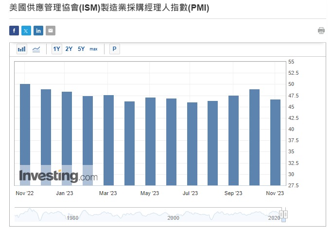 10月份谘商会消费者信心指数回落至102.6,略胜预期100,但比上月的104.3稍见回吐,已连跌3个月,更创出近5个月的低位。10月份美国供应管理协会ISM制造采购经理指数PMI报46.7,稍低预期及上月49。并创近3个月低位。数据反映出制造业萎缩程超过预期。年内第三季度非农生产力初值按季上升4.7%,高过预期4.1%。数据反映经济增长持续强劲。期内非农单位劳工成本初值按季跌0.8%,远差过预期升0.3%。数据反映劳工成本回落,连同早前的就业市场稍见放缓的配合,预计通胀有望向下。