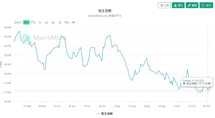 10月份内,恒指累跌697点,跌幅3.9%。连续3个月累跌2966点,跌幅超越14.8%